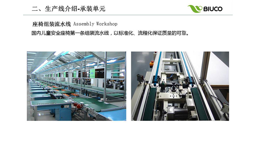 儿童安全座椅行业第一条信息化缝纫流水线,员工流水化作业,节拍化生产,让每个员工成为每个工位缝纫专家,让质量更稳定。