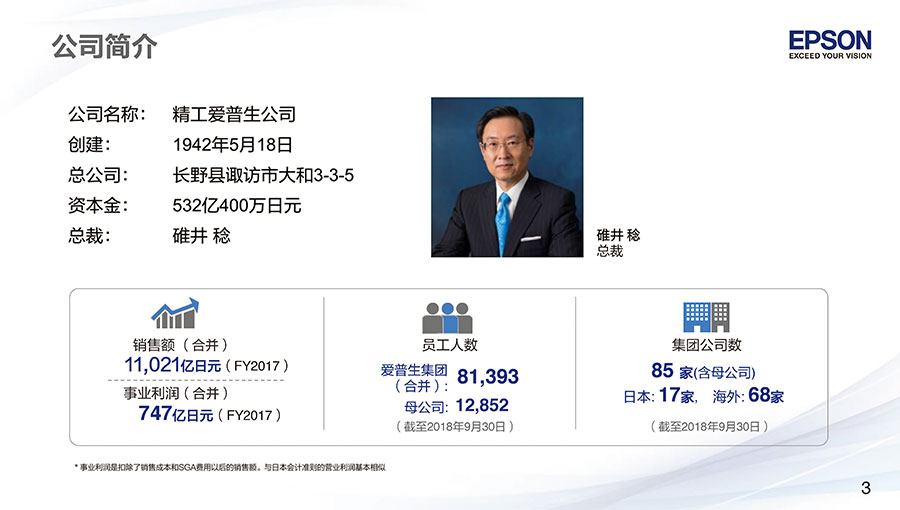 爱普生(中国)有限公司成立于1998年,总部设在北京,负责统括爱普生在中国的投资和业务拓展。目前,爱普生在华累计投资已超过8.22亿美元(约合50亿元人民币),共有10家制造、销售及服务等机构,员工逾16000人。